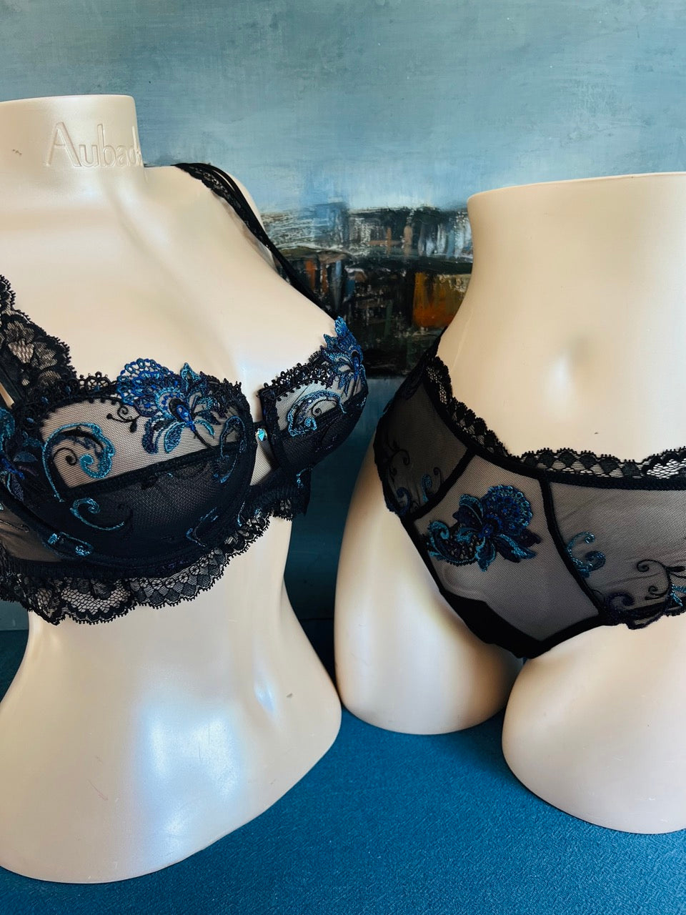 Nuit Élégance de Lise Charmel est une création d’exception, pensée comme une parure de minuit, envoûtante et mystérieuse. Entièrement travaillée en tulle noir d’une transparence sensuelle, cette lingerie s’enveloppe de dentelle fine et se pare de broderies bleu violet qui évoquent des reflets lunaires sur une nuit étoilée.