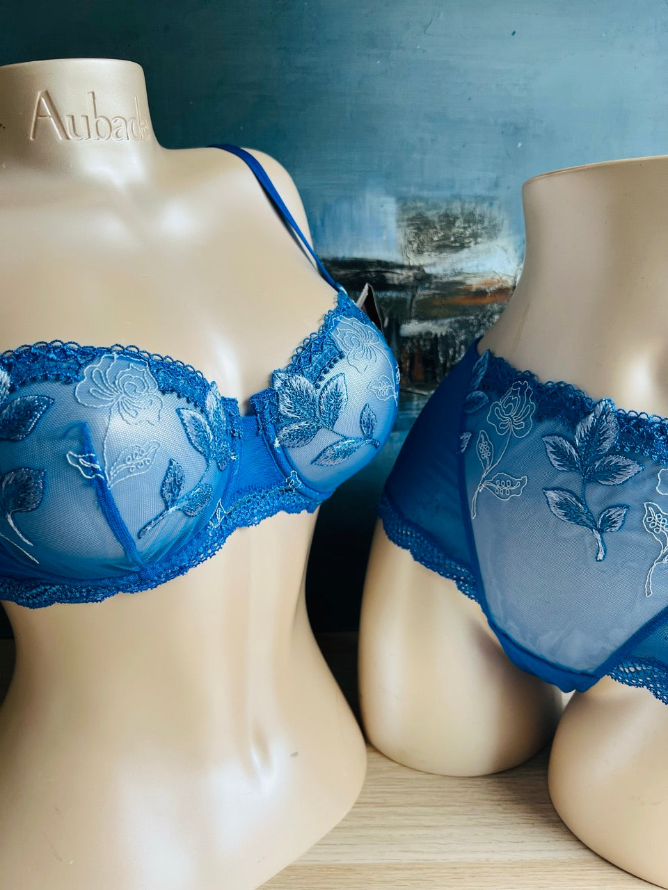 La lingerie Simone Pérèle LUDIVINE se pare d’un bleu roi profond, riche et vibrant, sublimé par des fils de broderies irisées déclinant plusieurs nuances de bleu qui captent la lumière avec délicatesse. Les motifs brodés, raffinés et graphiques, ajoutent du relief et une touche de sophistication aux pièces.
