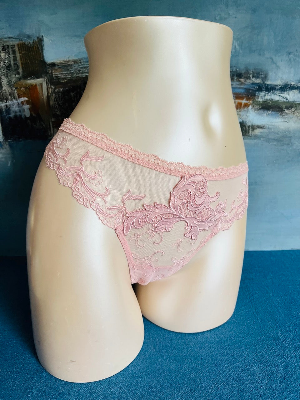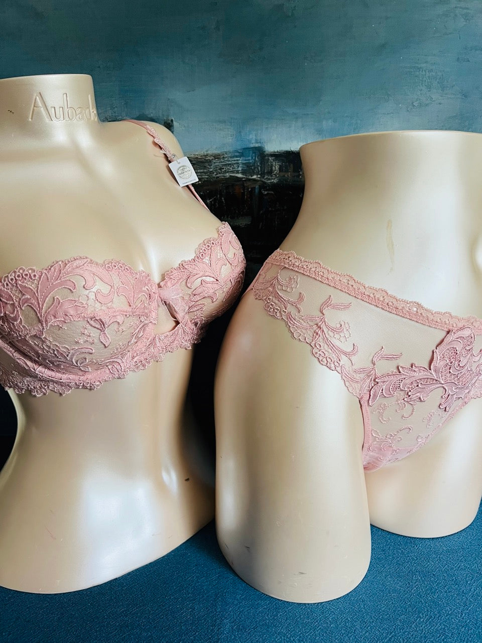 Véritable œuvre de haute lingerie, la collection "Acanthe Arty" par Lise Charmel marie l'inspiration florale classique à une sensibilité artistique contemporaine. Travaillée en guipure rose clair, cette création d’exception évoque la délicatesse d’un dessin à l’encre fine sur peau nue. La guipure, d’une extrême précision, forme de grands motifs d’acanthes stylisées — ces feuilles ornementales inspirées de l’art antique — réinterprétées dans un esprit graphique et moderne, presque comme un croquis vivant. Le rose clair, tendre et lumineux, vient adoucir cette richesse visuelle avec une touche de romantisme délicat.