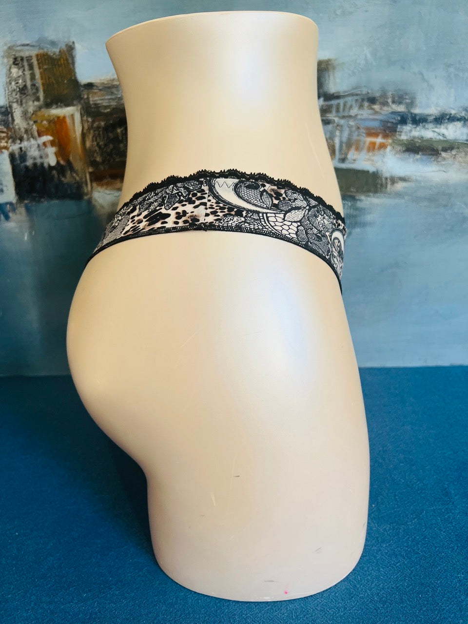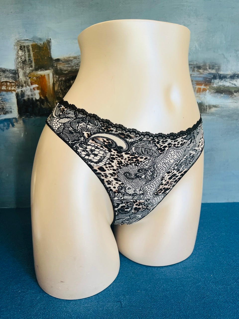Sur un fond rose pâle délicat, ultra féminin et tendre, se déploie un motif de dentelle noire imprimée bluffant de réalisme. Chaque détail, chaque effet de transparence, chaque feston a été pensé pour imiter à la perfection une véritable dentelle, créant une illusion subtilement sexy sans sacrifier la douceur du tissu.