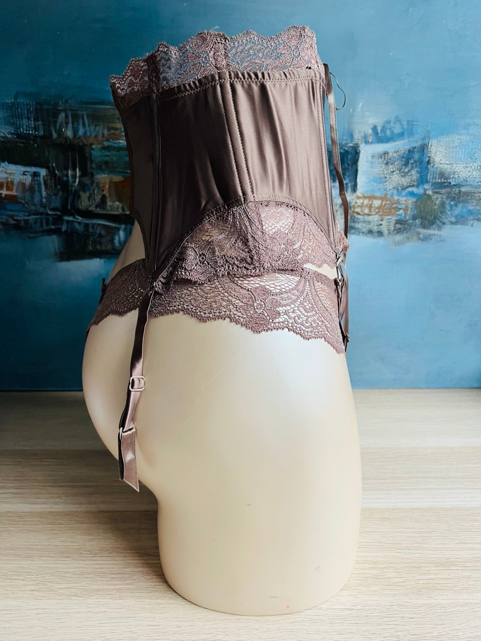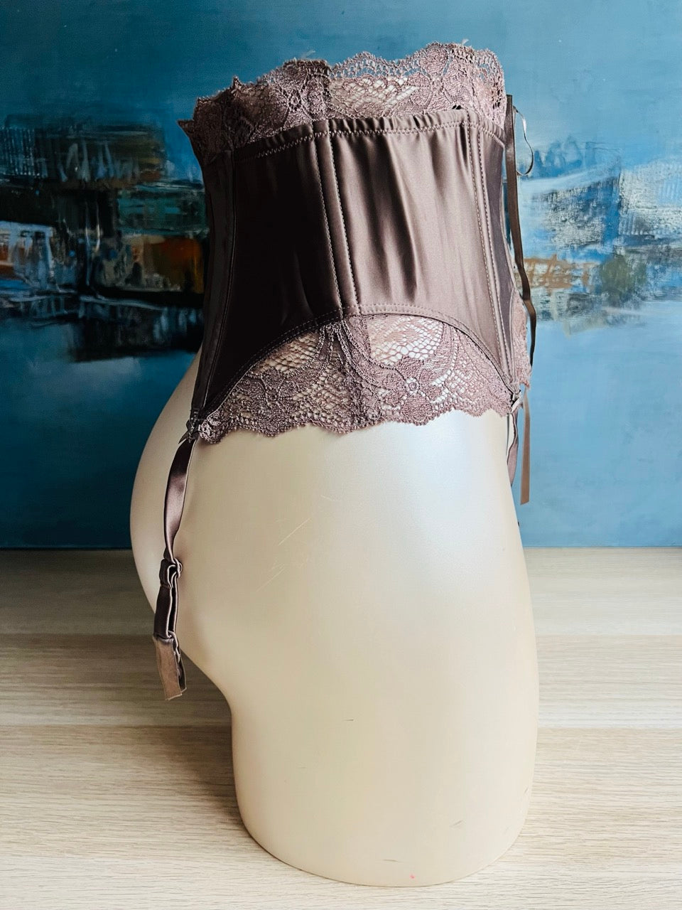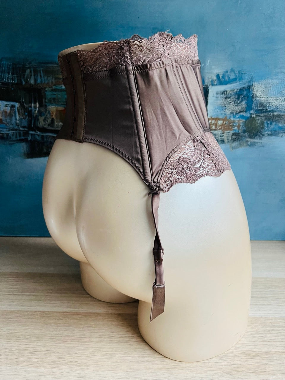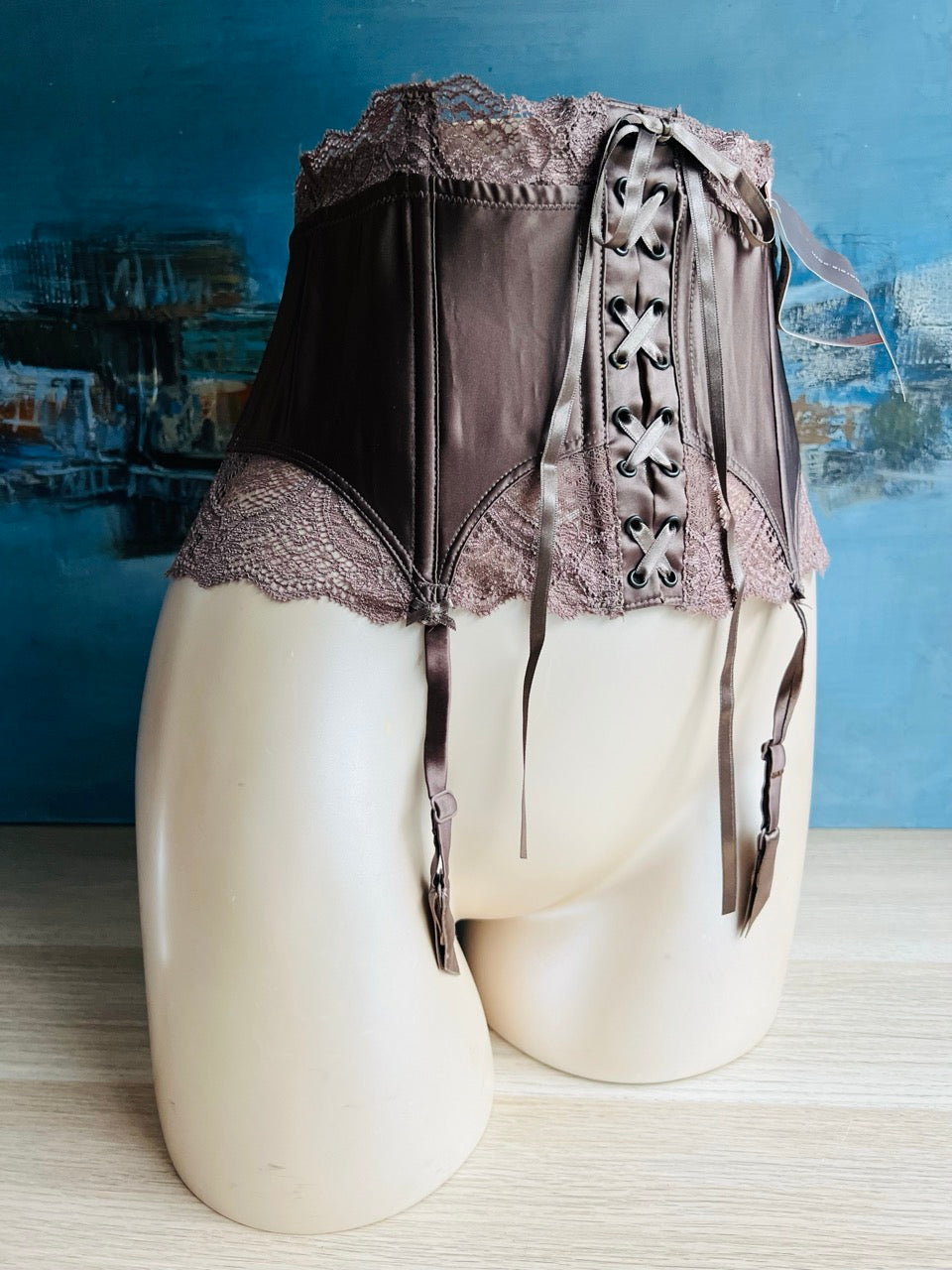 Le porte-jarretelles est conçu pour maintenir les bas en place. Il se compose généralement d'une bande élastique qui s'attache autour de la taille et de plusieurs attaches ou clips, appelés jarretelles, qui pendent vers le bas pour attacher les bas.