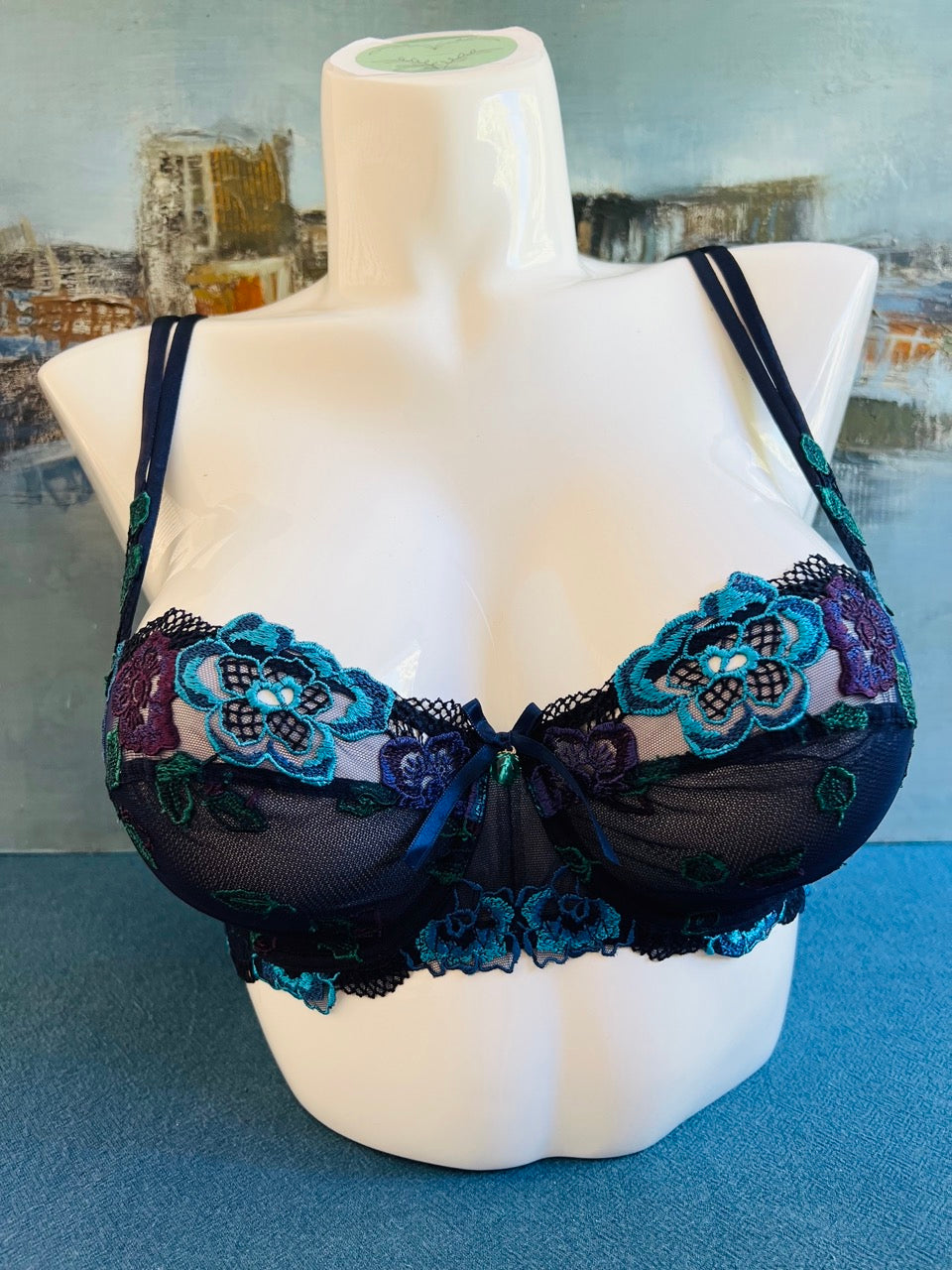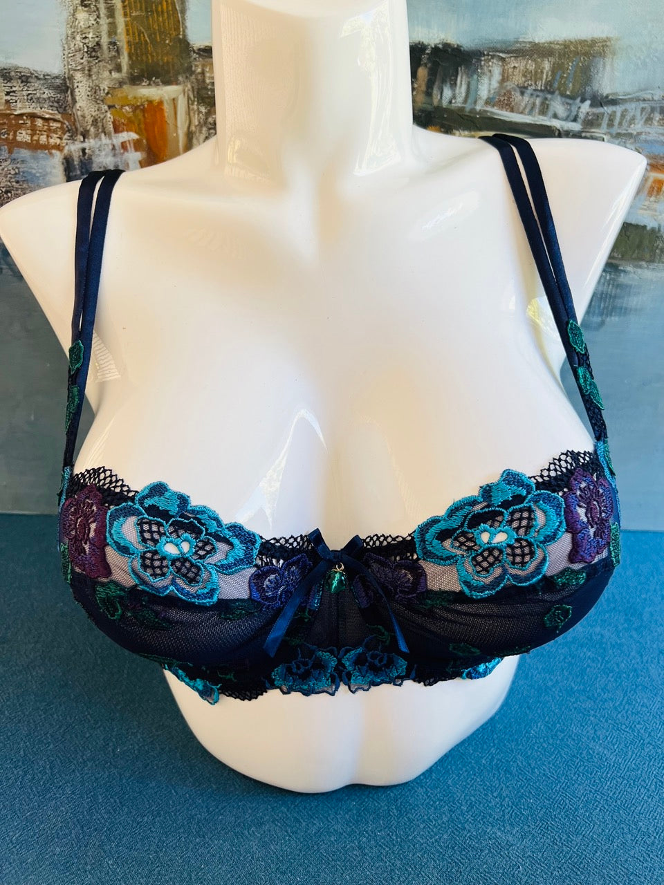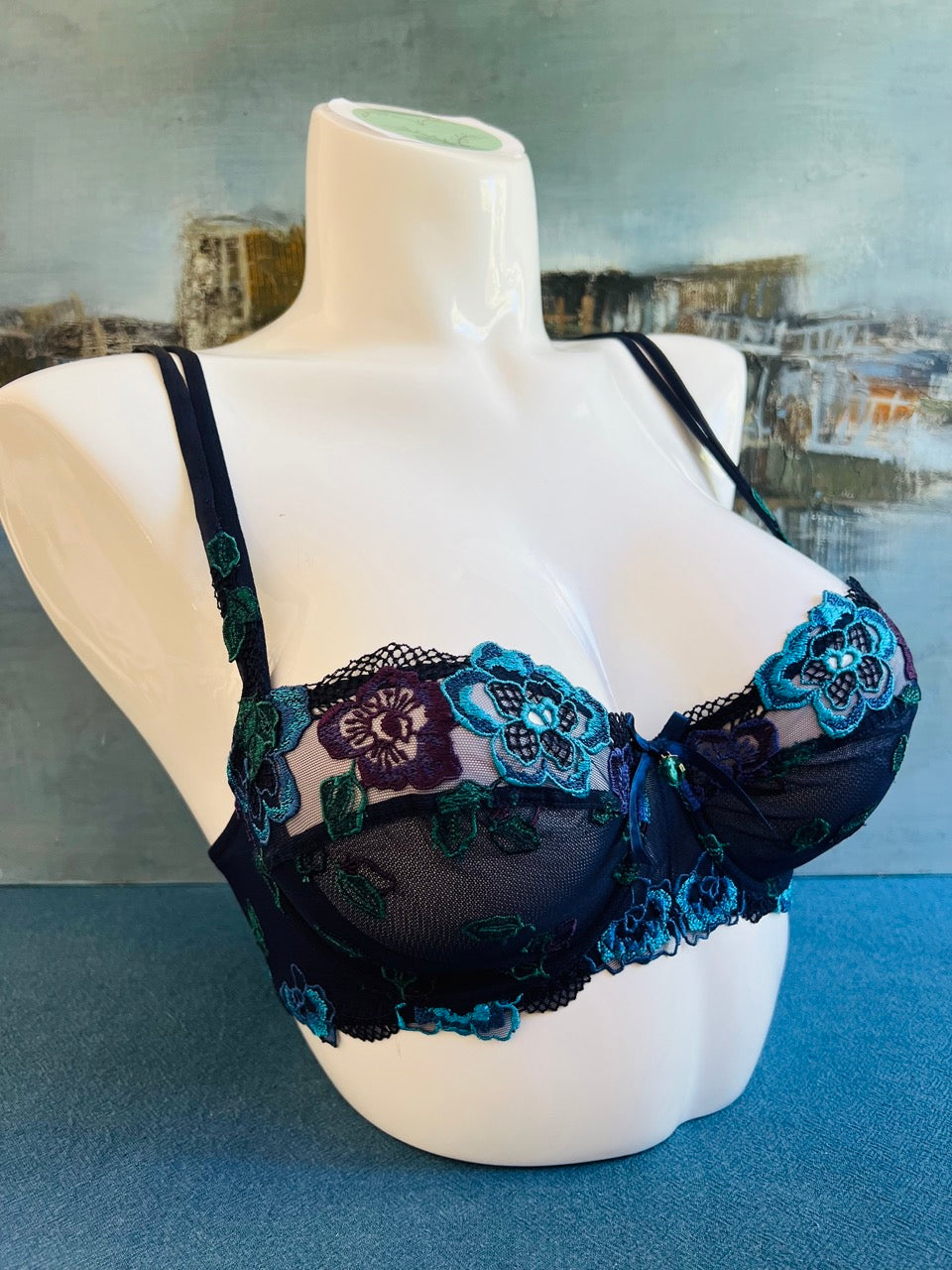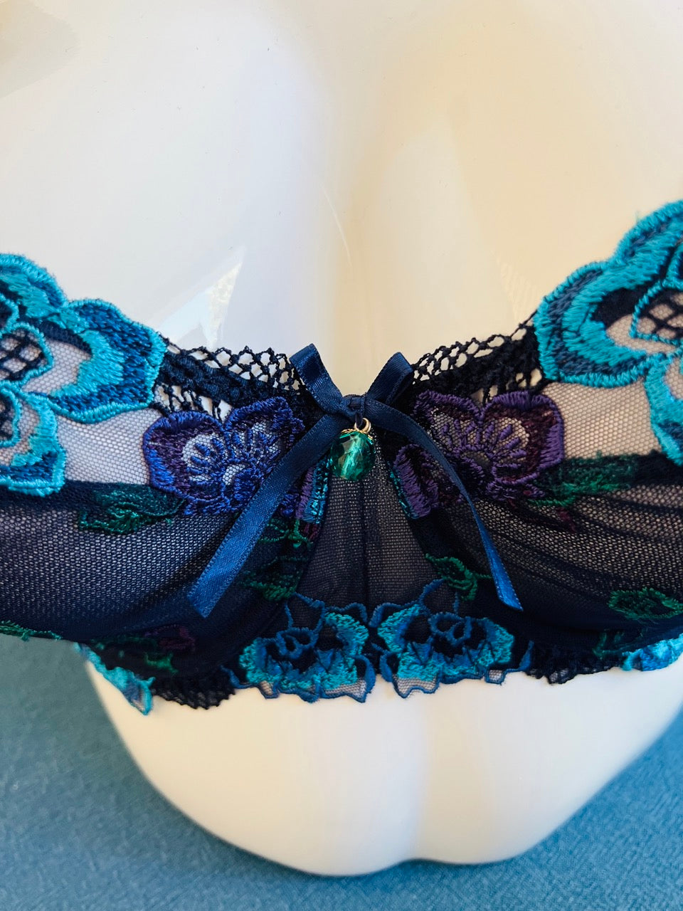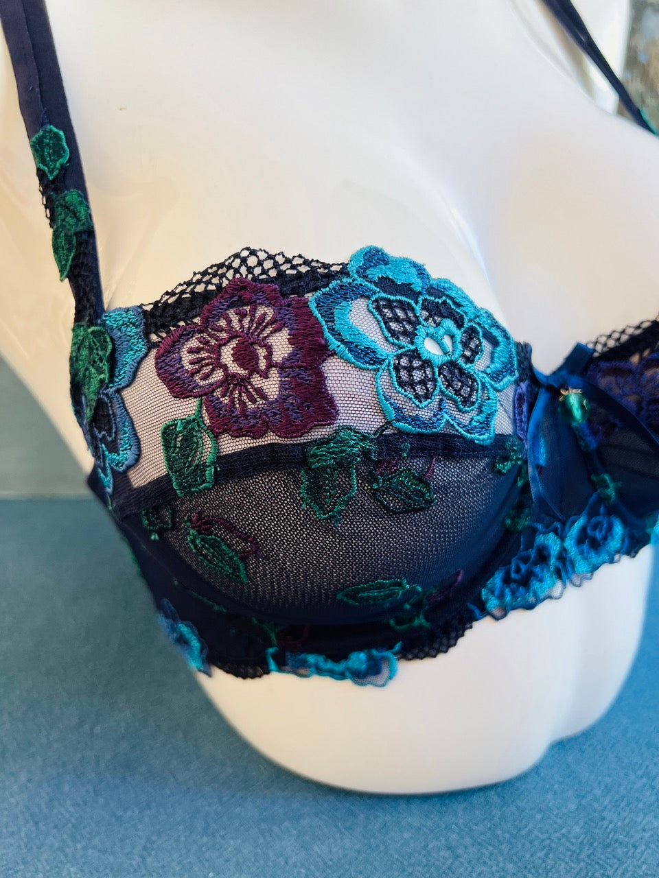 La lingerie Lise Charmel de la collection Mélodie du Plaisir, en bleu marine rehaussée de fleurs turquoise, vertes et violettes, est une véritable ode à la féminité sensuelle et raffinée. Une collection pensée pour les femmes qui aiment conjuguer sophistication et poésie jusque dans les moindres détails.