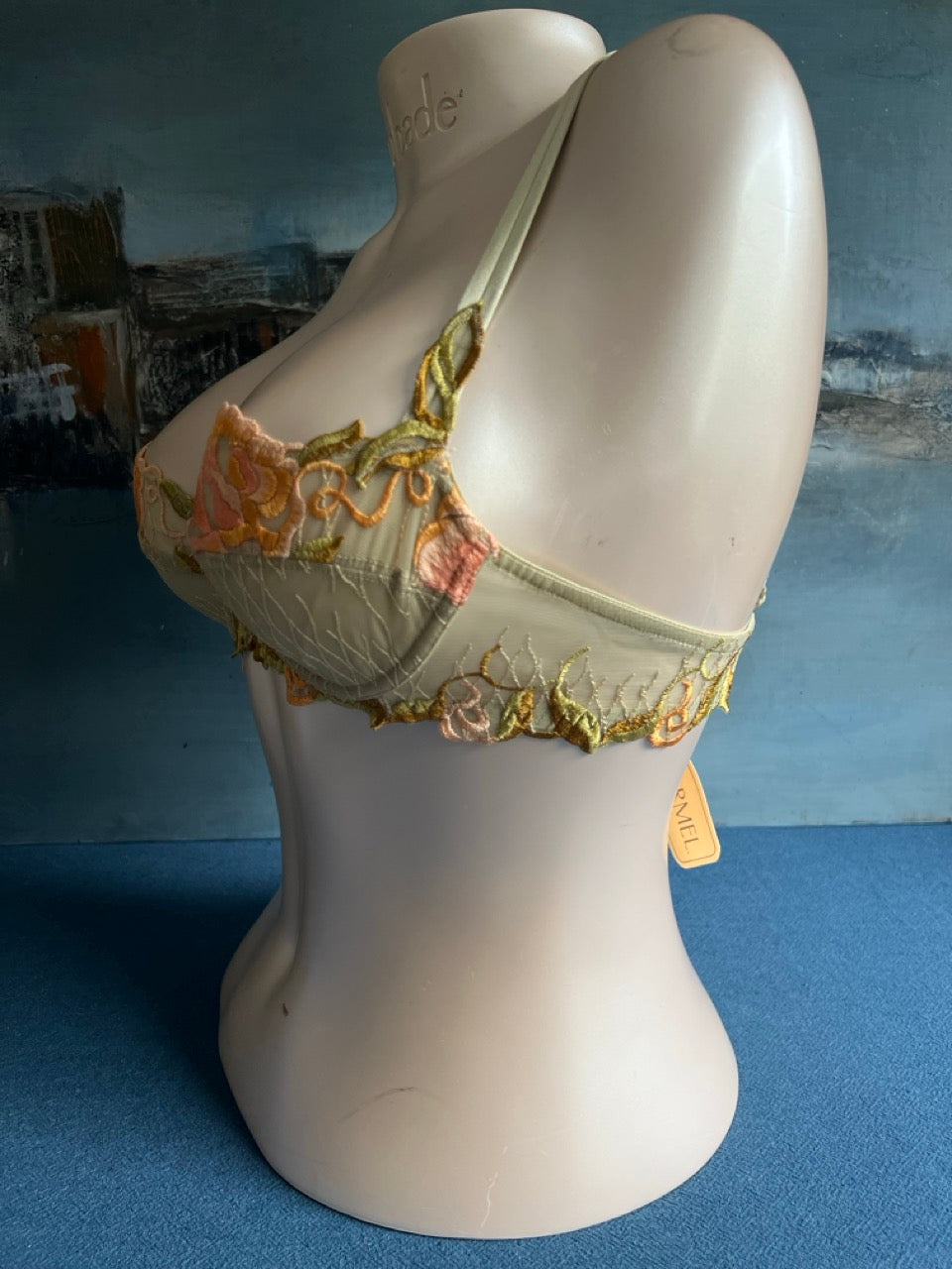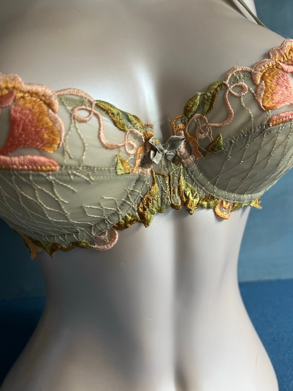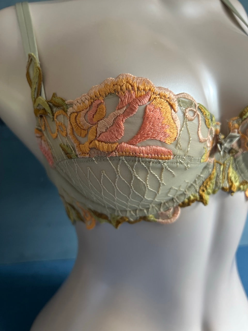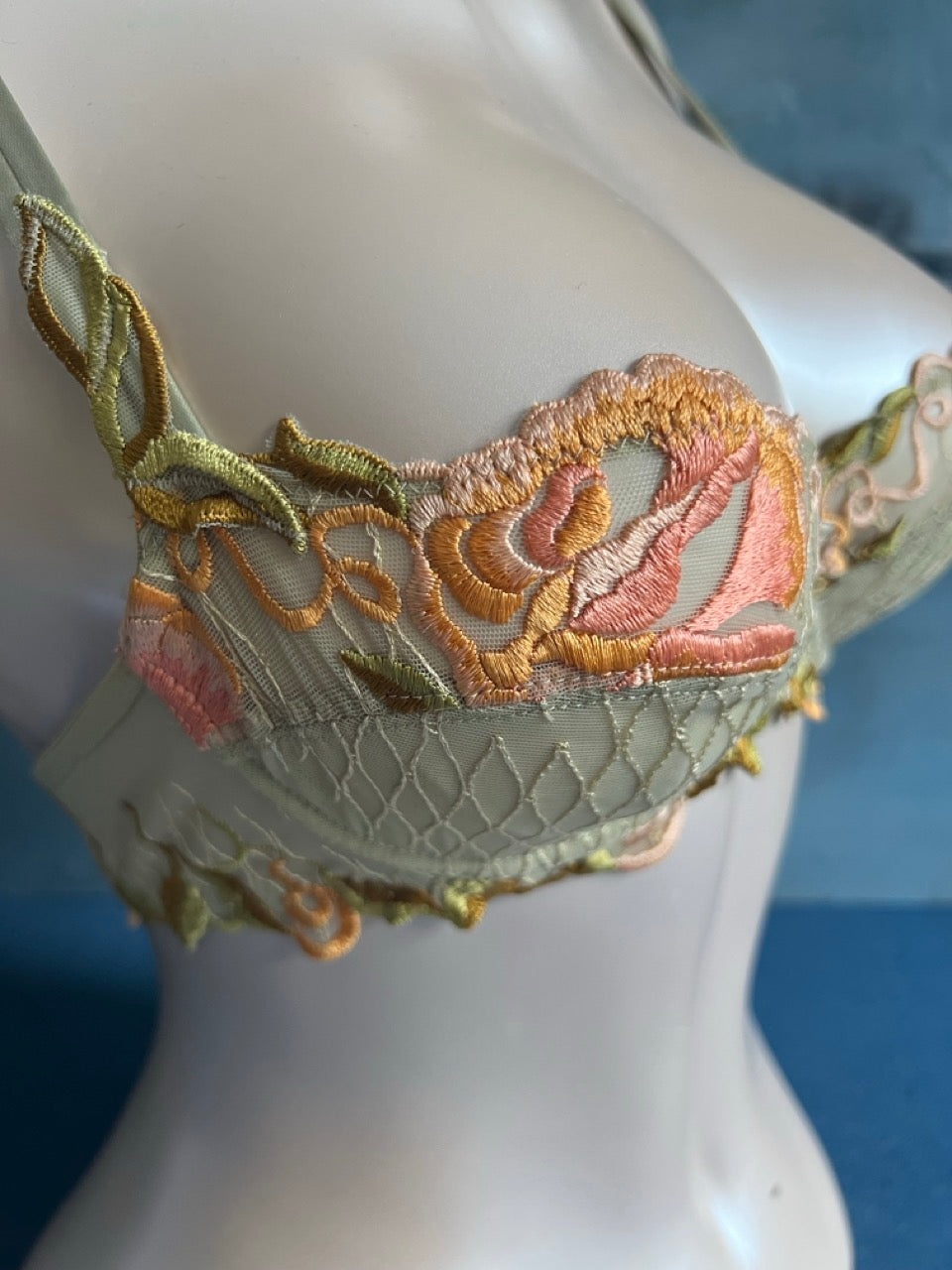 Un ensemble de lingerie Lise Charmel aux accents rétro et vintage, empreint de charme et d'élégance intemporelle. La teinte principale, un vert amande doux et apaisant, évoque une fraîcheur printanière et met en valeur des détails sophistiqués. De grosses roses brodées dans des tons de rose poudré et de corail viennent orner les bonnets, se détachant avec élégance sur le fond vert amande.