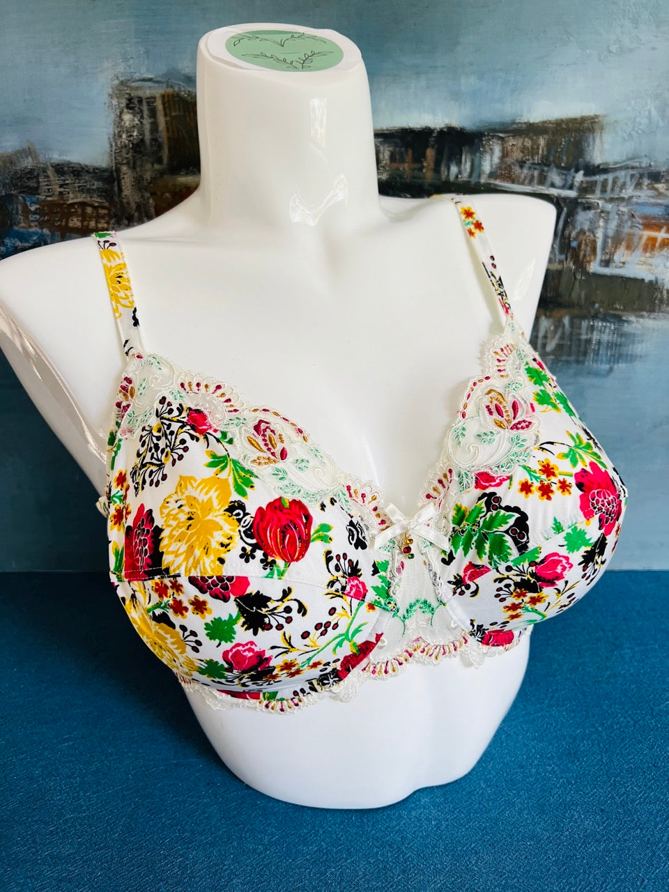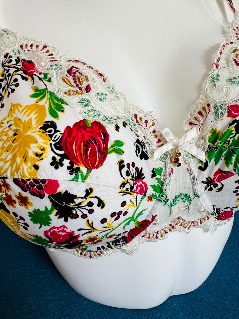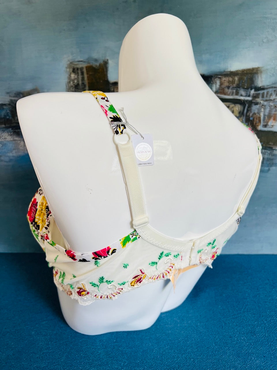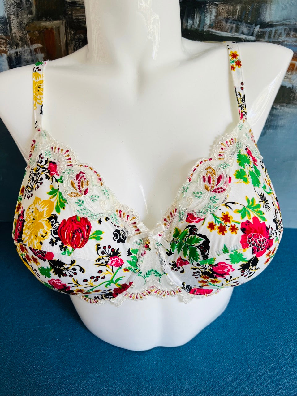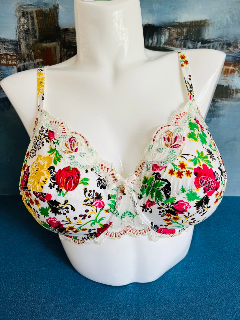 Laissez-vous envoûter par la délicatesse ensoleillée d’Aria Pastel, une création signée Lise Charmel qui célèbre la fraîcheur du printemps dans un écrin de raffinement. La pièce s’habille d’un fond neutre et raffiné qui sert d’écrin à un imprimé floral éclatant, où s’épanouissent des fleurs aux couleurs vives – tons fuchsia, vert et jaune – dans une composition à la fois joyeuse et sophistiquée, digne d’un jardin impressionniste. Sur les bonnets, une broderie délicate vient sublimer le motif, apportant du relief et de la profondeur à l’ensemble, tandis que des touches de dentelle ajourée, légères et féminines, soulignent les courbes avec finesse. Collection ornée de bijoux Swarovski.