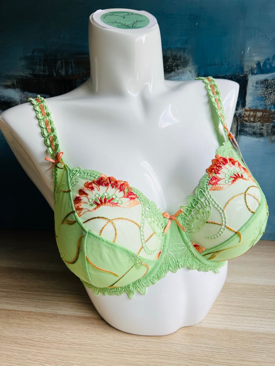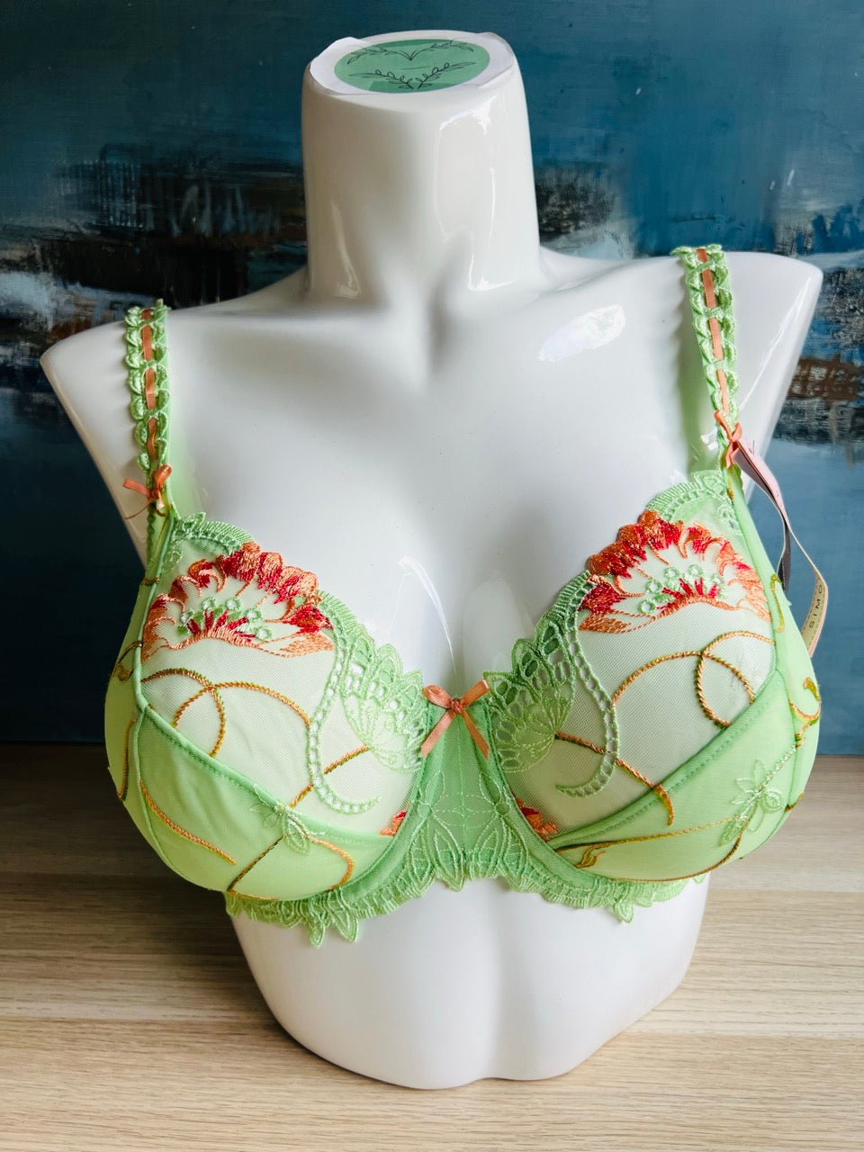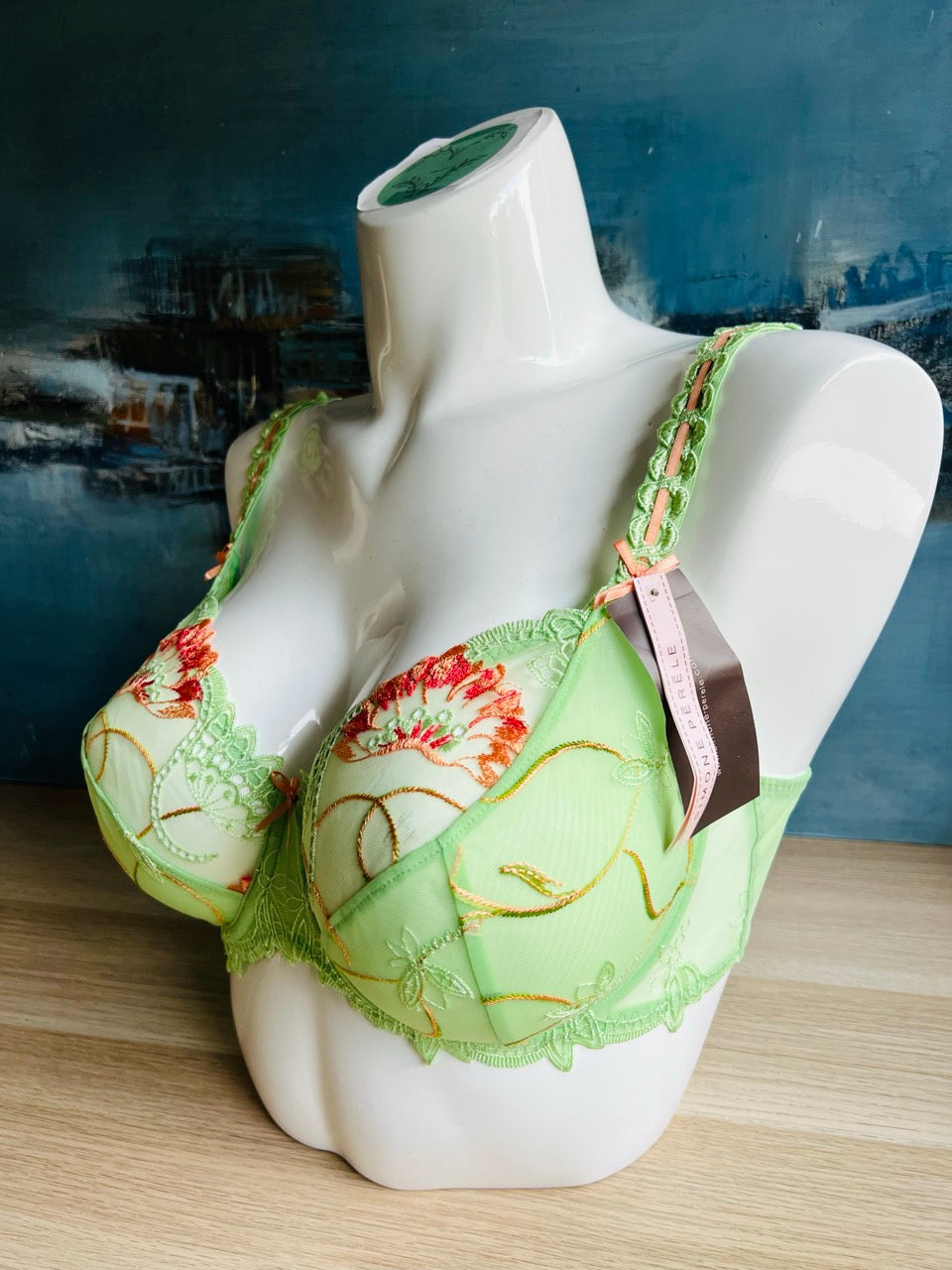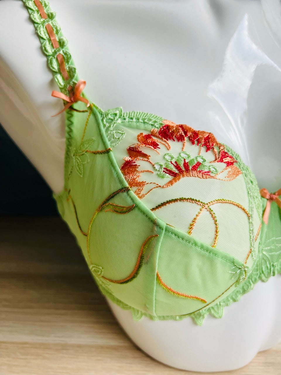 La collection DELICE de Simone Pérèle se distingue par une base vert pomme vibrante, fraîche et pleine de pep’s, qui capte l’œil tout en restant élégante. Sur cette toile lumineuse, des broderies délicates tissées de fils rouge abricot tissent des motifs floraux et graphiques, créant un contraste intense et sophistiqué.