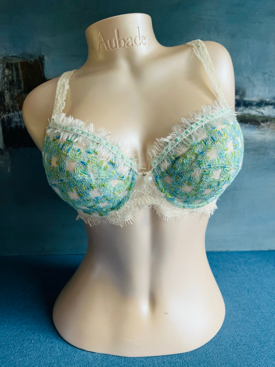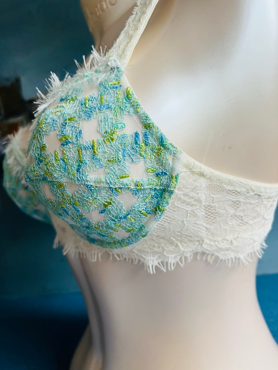 Fidèle à l’esprit de la haute couture avec du tweed bleu et vert sur fond blanc, cette lingerie est un modèle exceptionnel et luxueux, mariant sophistication et audace.