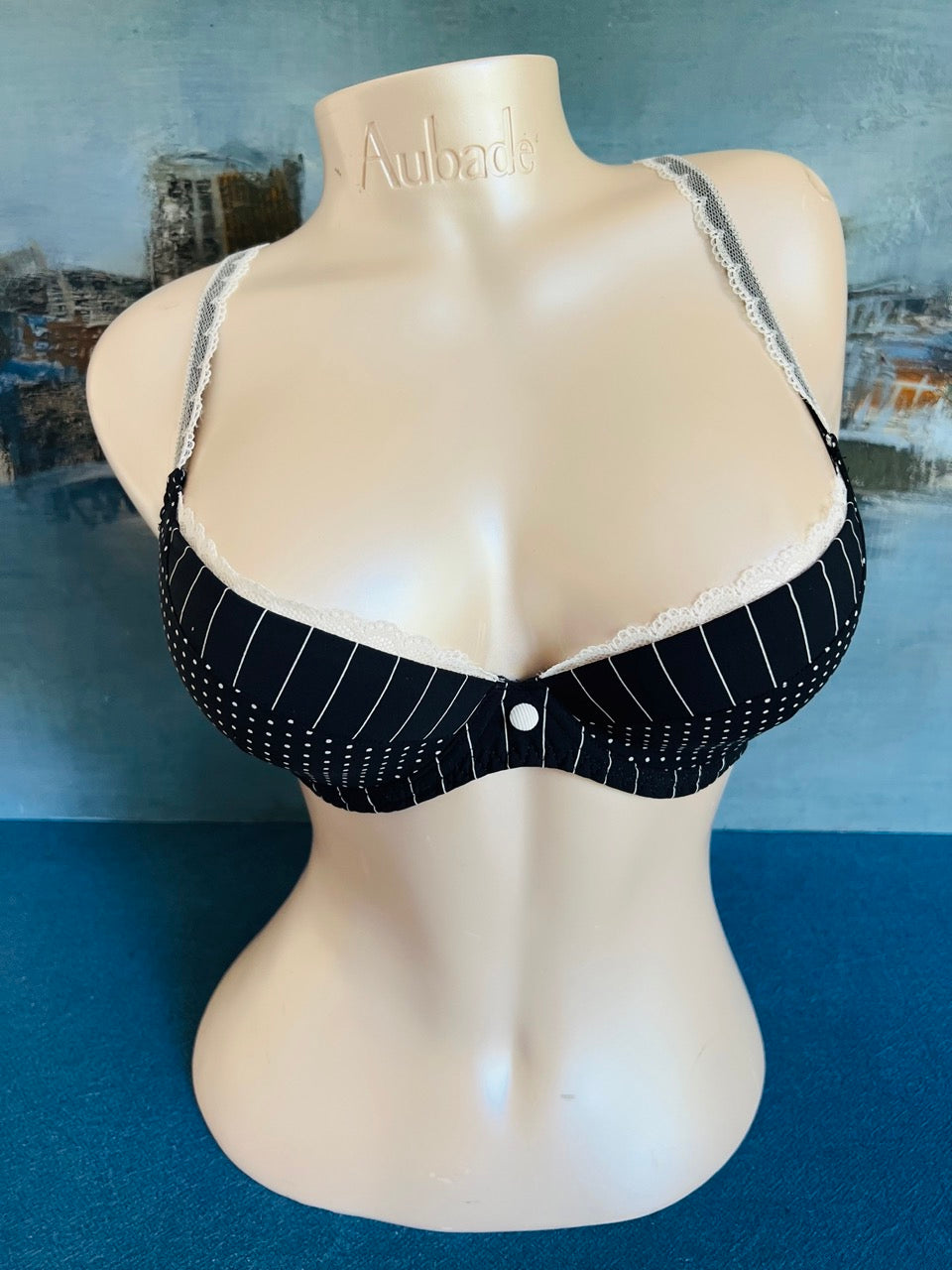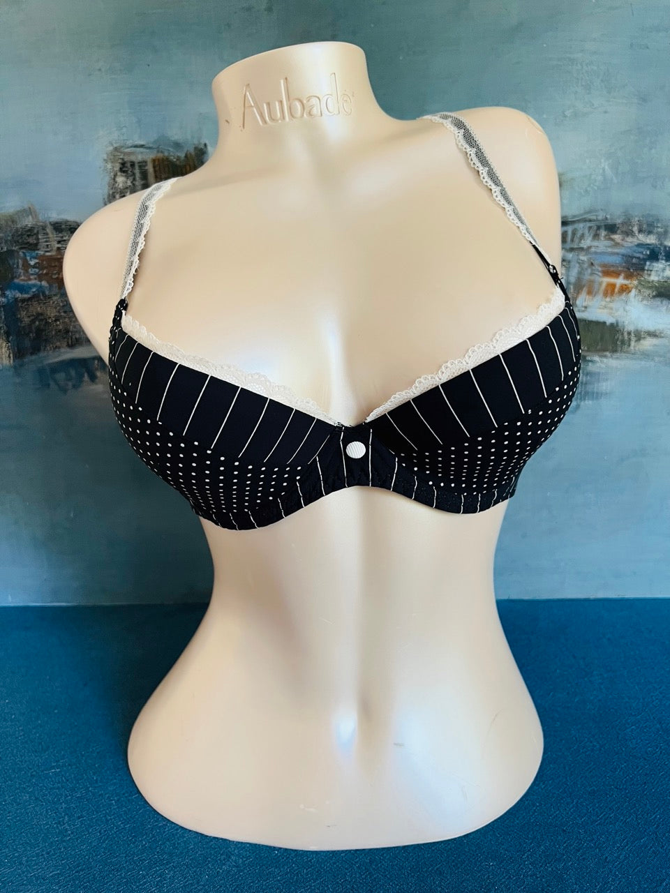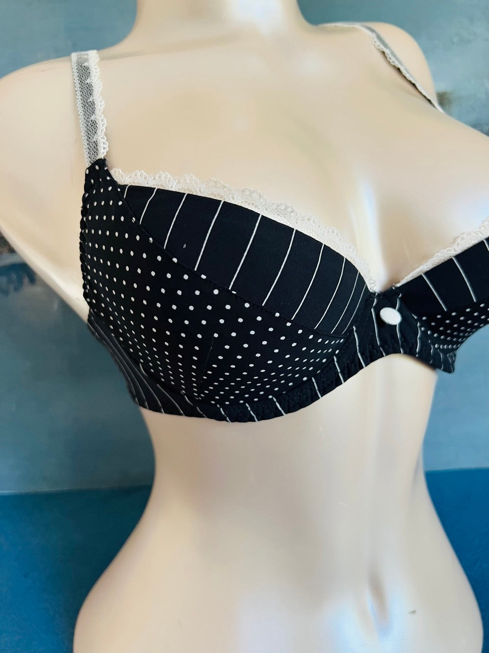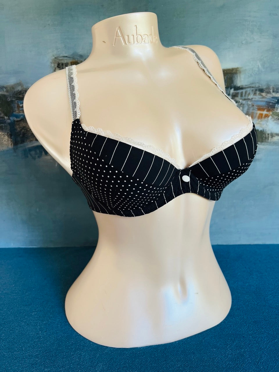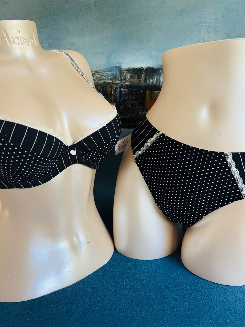 La lingerie Antigel "Beauté Dandy" de Lise Charmel joue sur un esprit rétro-chic, très inspiré des années 40-50. Elle se décline en noir, avec un élégant contraste apporté par des touches crème. Le tissu mêle plusieurs motifs : des rayures verticales qui affinent et allongent la silhouette et de petits pois crème qui apportent une note espiègle et vintage.