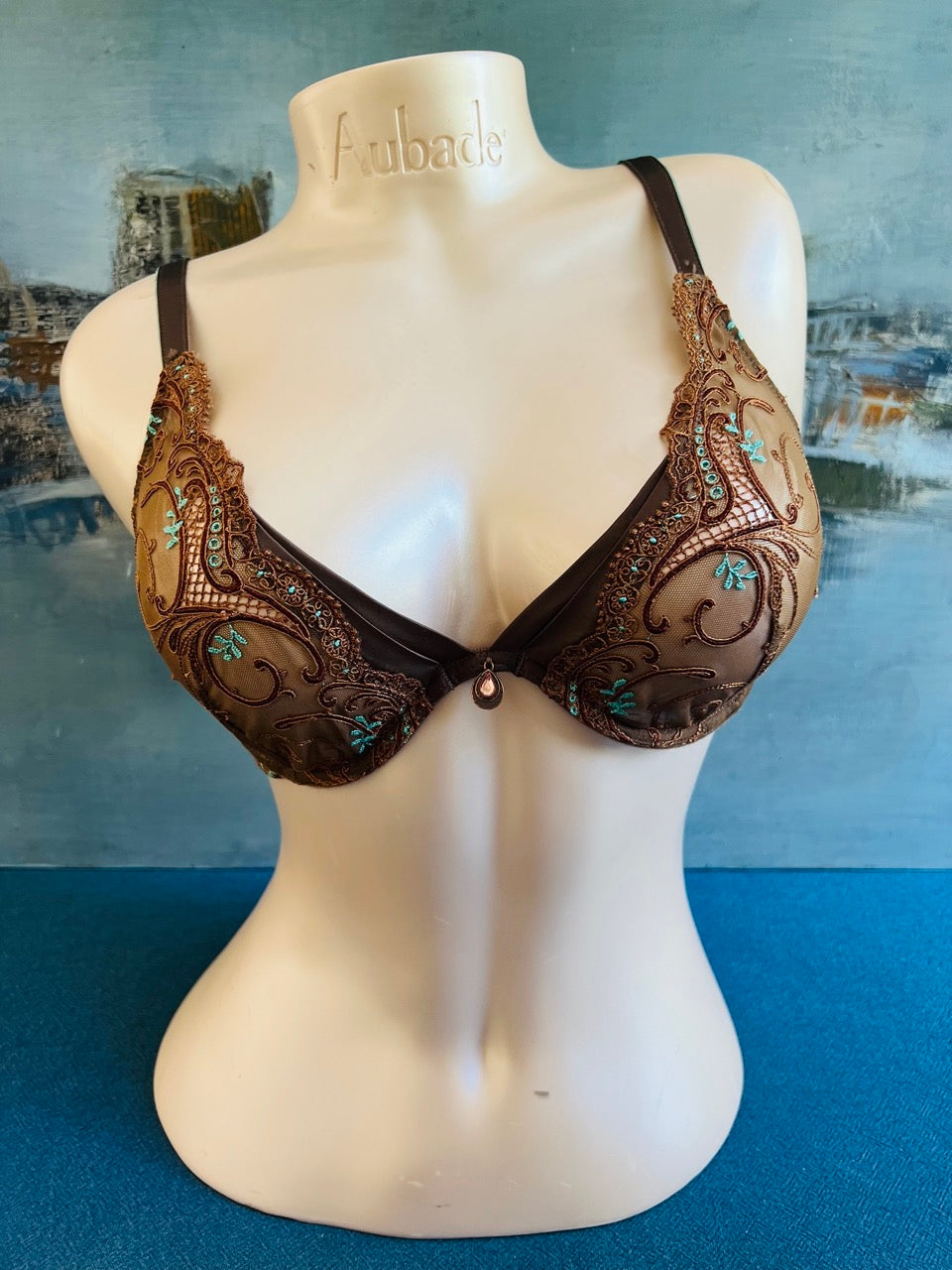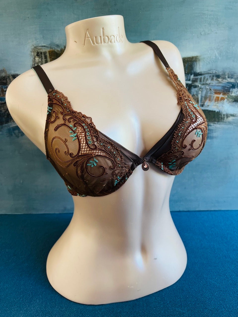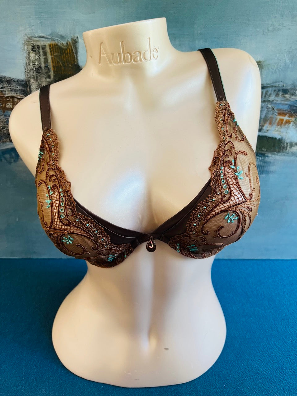 La collection Fée Palmyre de Lise Charmel est une invitation à la magie des contrastes. Dans cette version audacieuse, le marron profond se mêle à l’éclat vif du bleu turquoise, pour une création à la fois mystérieuse et lumineuse.